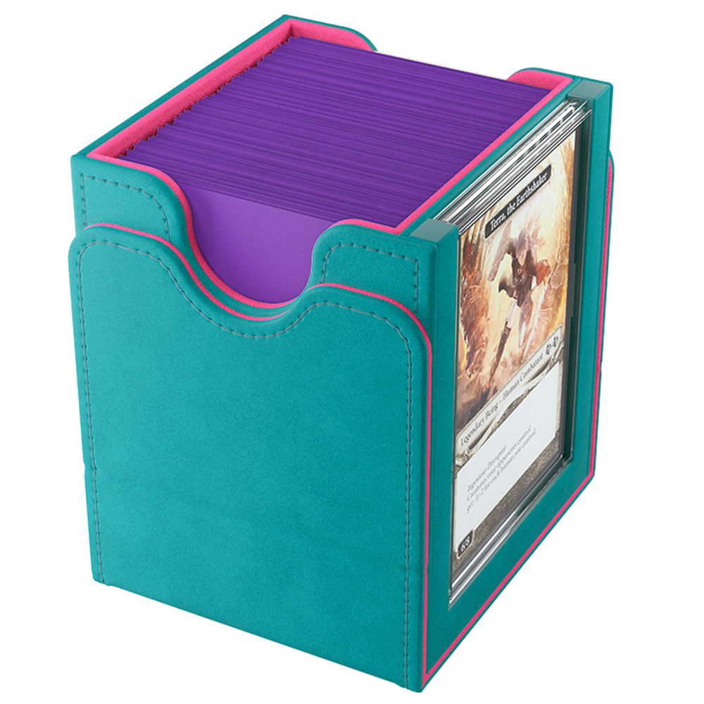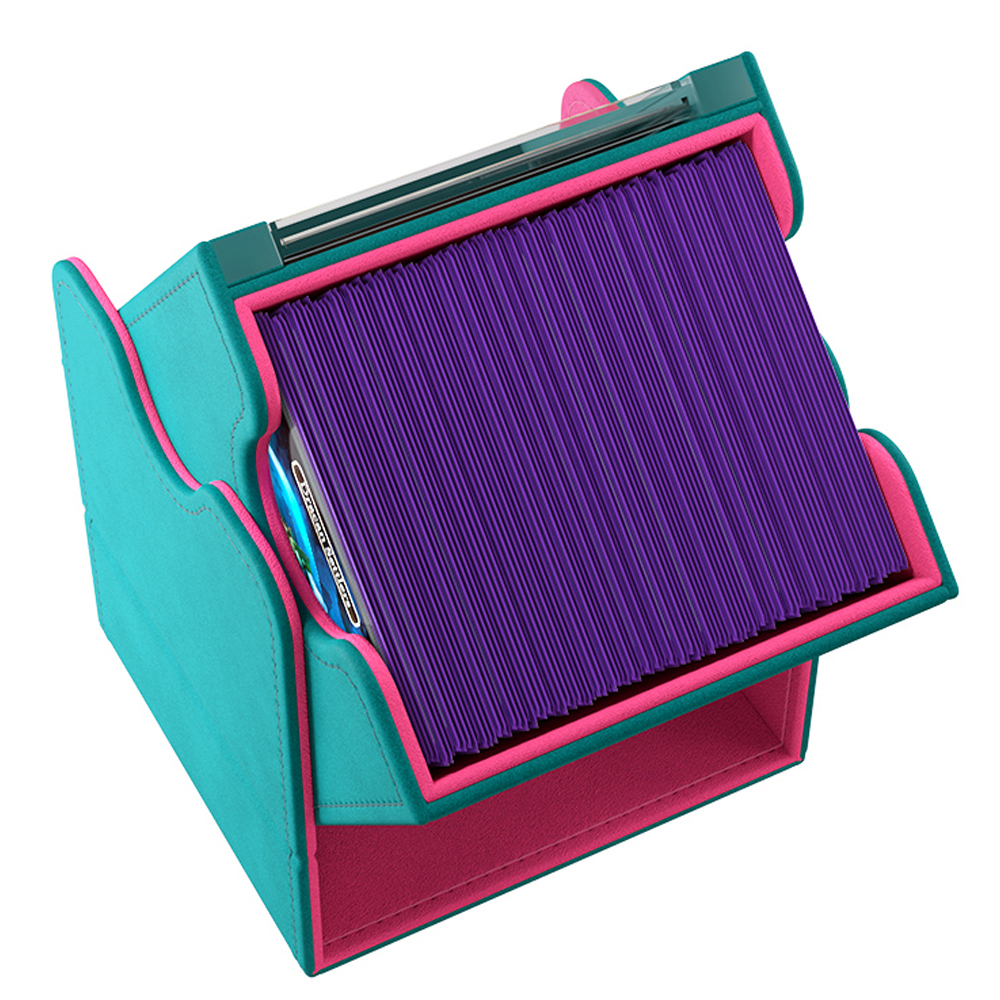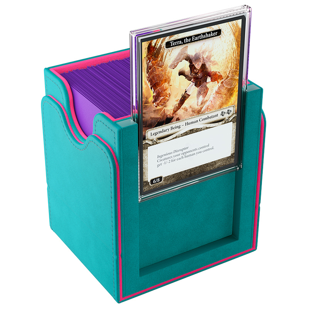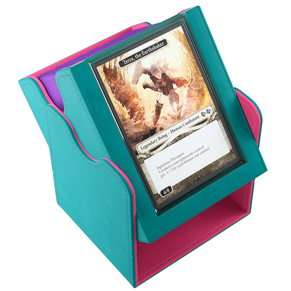 The Squire PLUS holds 100 double-sleeved cards in extra Thick Inner Sleeves. It can also fit 100 regular double-sleeved cards and has extra room for token cards. This premium box is also equipped with our highly rated convertible system: The completely removable cover clips onto the bottom, saving precious space on the gaming table.