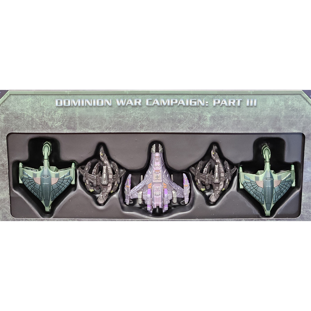 Dominion War Campaign: Part III together, including painted plastic ships, cards, tokens, and a 7-mission campaign book. With multiple copies of this set, up to 6 players can battle the Dominion together!