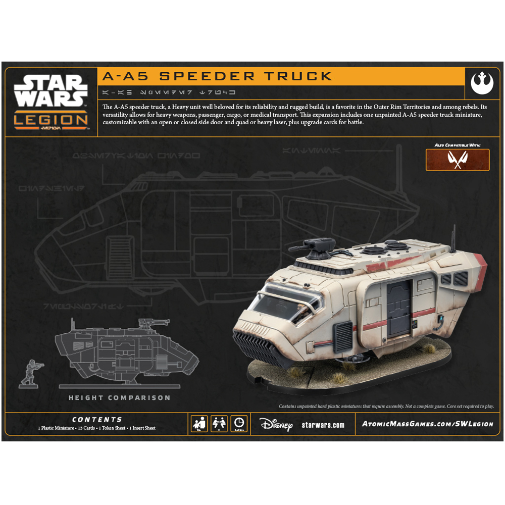 The A-A5 Speeder Truck can be assembled with its side door open or closed and outfitted with either a quad laser or a heavy laser retrofit, allowing players to personalize the way they want their truck to look on the battlefield. In addition to these cosmetic customizations, the included upgrade cards allow players to decide how the A-A5 Speeder Truck operates in battle!