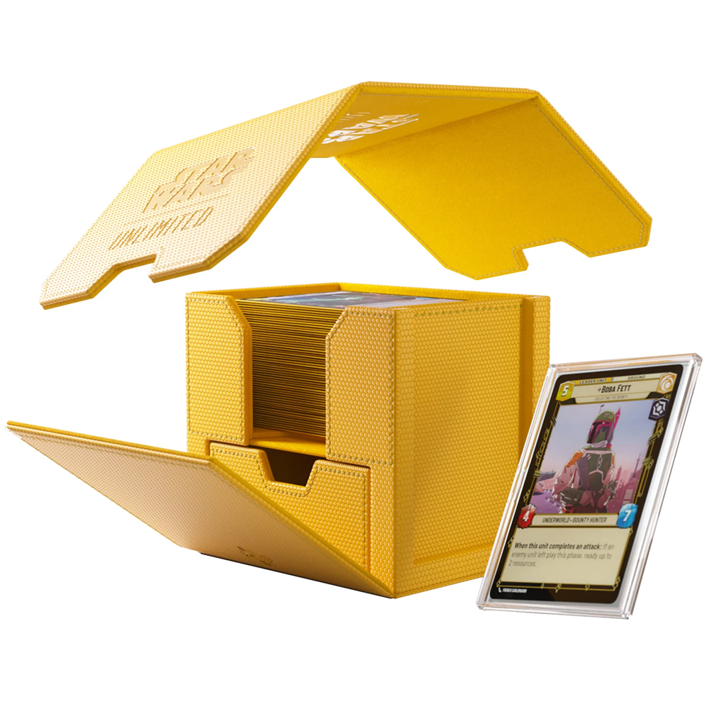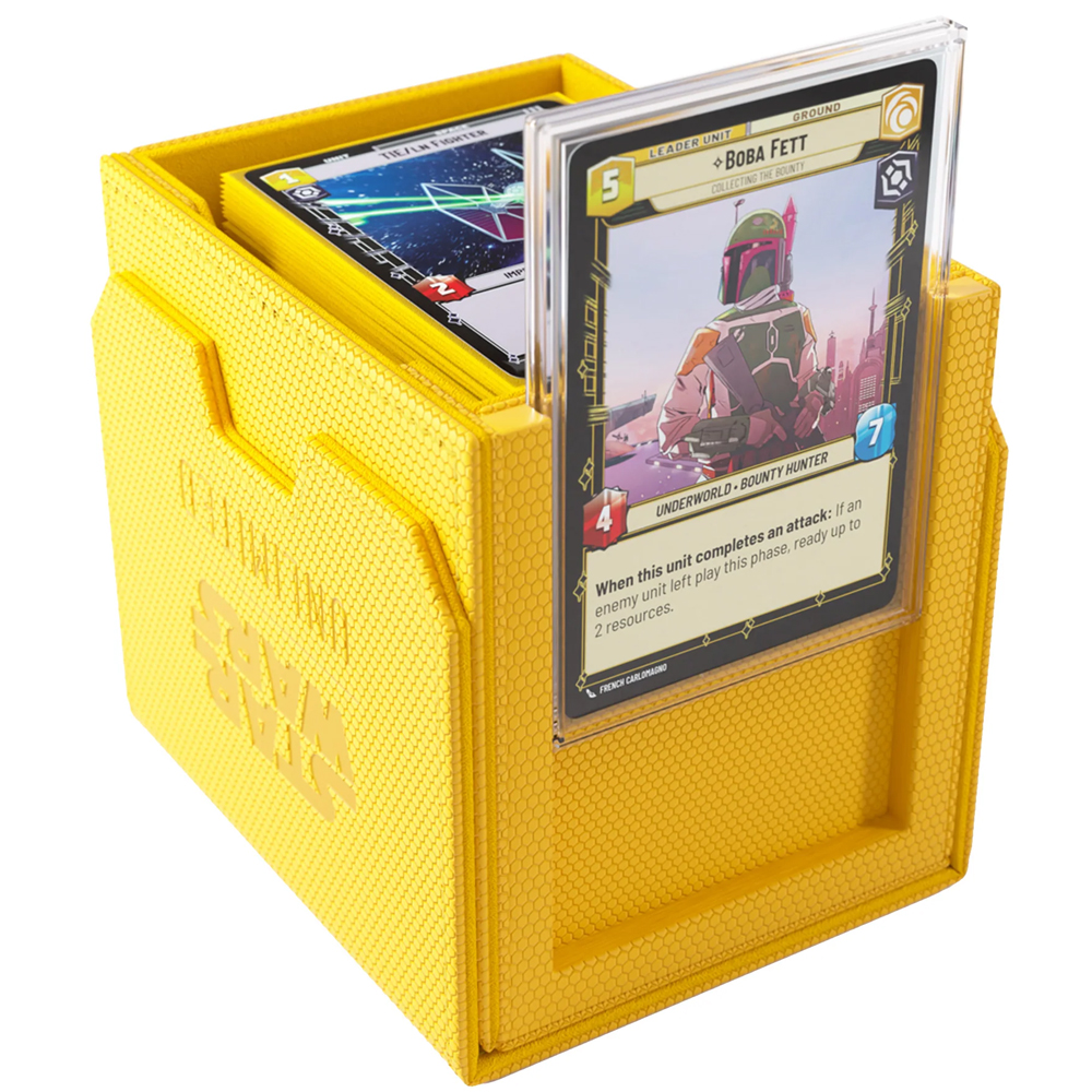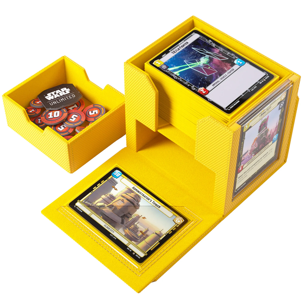 A fantastic deck box that is star wars themed. Had a spot for tokens and dice nested inside so it won't spill. Holds sleeved cards, and can fit a hard case deck box also to really double down on the protection. Good quality build and should last for. Long time. Single card holder could be better for display card, but works well and provides protection to the card inside, and is a nice display window.