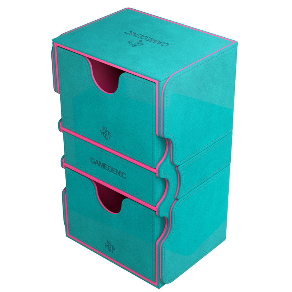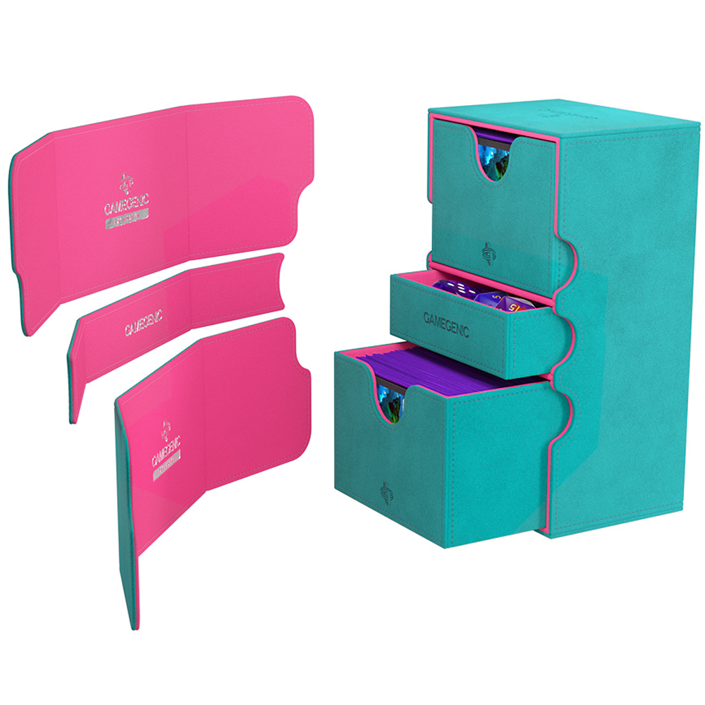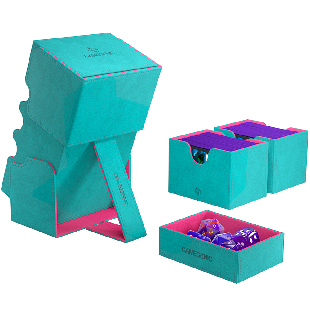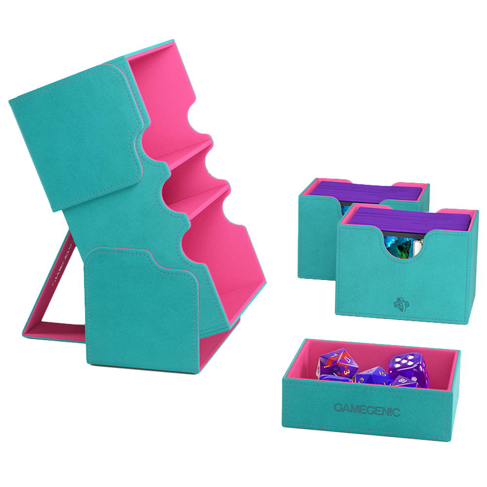 The Stronghold 200+ XL is made to fit 200 double sleeved cards in extra Thick Inner Sleeves. Elegant outside material in TEAL Nexofyber+ with soft PINK microfiber inner lining create a new striking color combination! Includes two removable card holders to keep up to 200 double sleeved cards in this large and extremely robust deck box. Just like other Convertible products, its flaps are removable and can be clipped to the back of the box to save precious space on the gaming table. Powerful magnets ensure a safe closure.