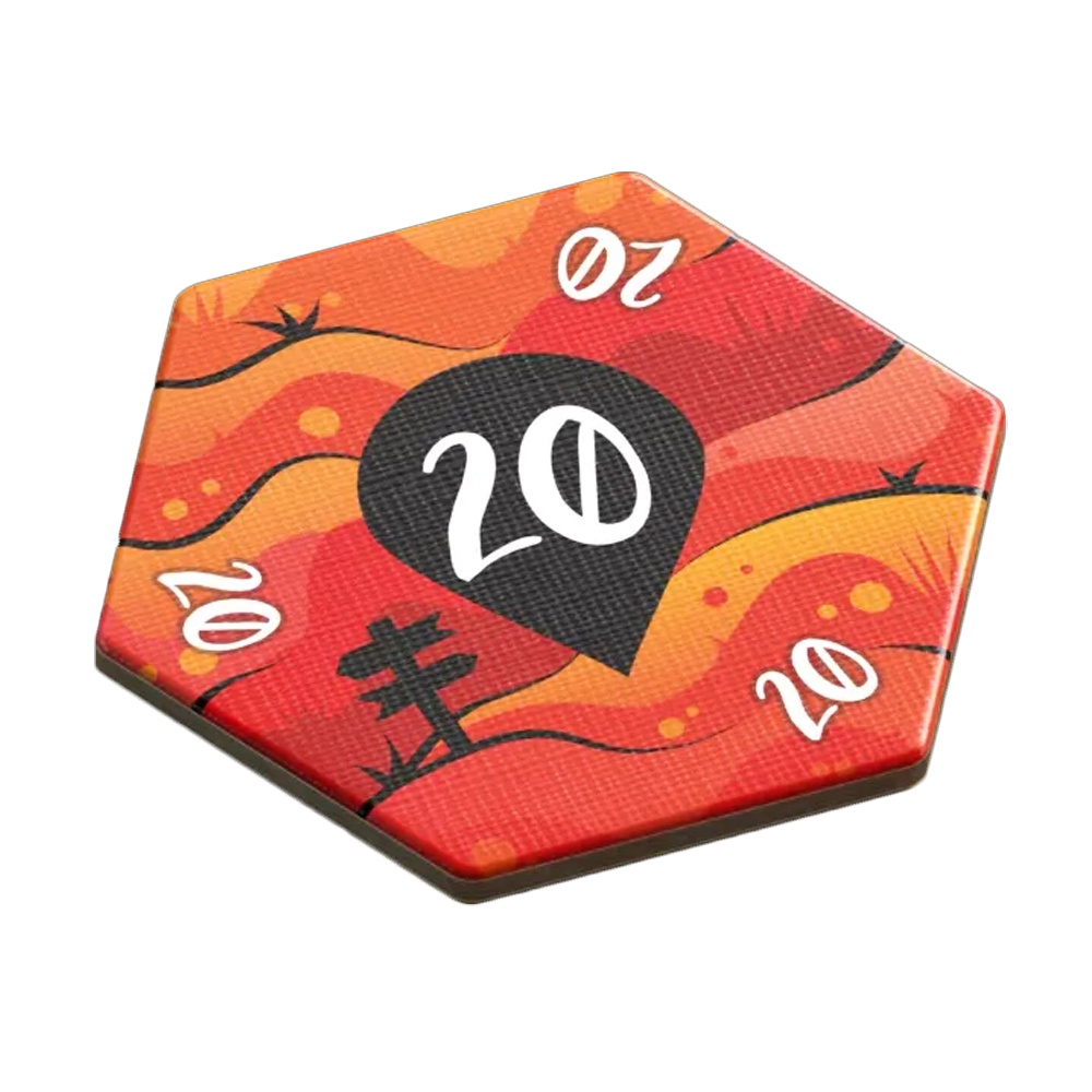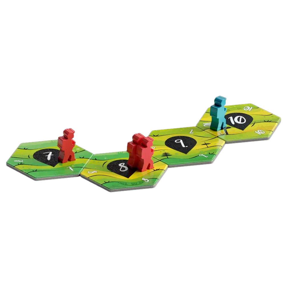 Hikers only score if they are on a path of 4 continuous numbers. Do you join an opponents' trail to team up, or block their path with one of your own? Do you forgo a sure placement to buddy up your hikers for a perfect space next turn? Will that space even be available next turn?