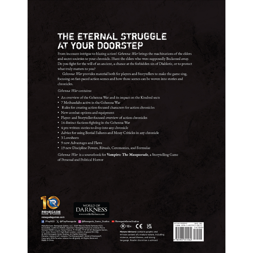 Gehenna War provides material both for players and Storytellers to make the game sing, focusing on fast-paced action and how to weave it into stories and chronicles.
