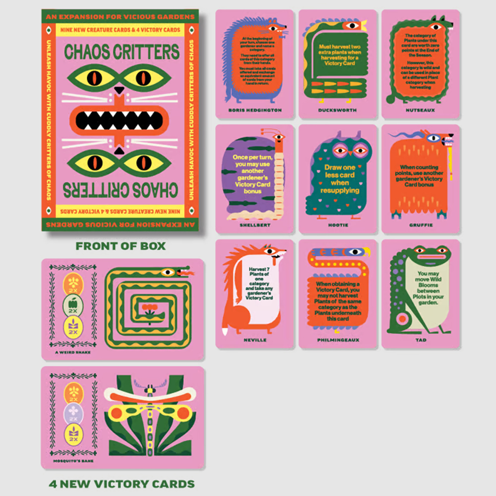 Chaos Critters! Incorporated in the Specialist Deck, these critters will give your garden unique perks or inhibit your neighbors. You must keep them fed with a steady supply of plants. Otherwise, they may find their way to your competitors! Chaos Critters have no loyalty, they just want to nosh.