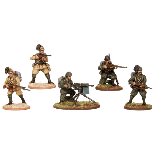 This hard plastic box set allows you to build up to 32 soldiers equipped with standard Carcano rifles and carbines, Beretta Model 38s, Breda 30s, grenades, pistols, and more. You can also build up to two Breda 37 heavy machine guns with crew. Several different heads are included for all figures including the standard helmet, pith helmet, Alpine hat, Bustina, and separate feathers to create Bersaglieri!