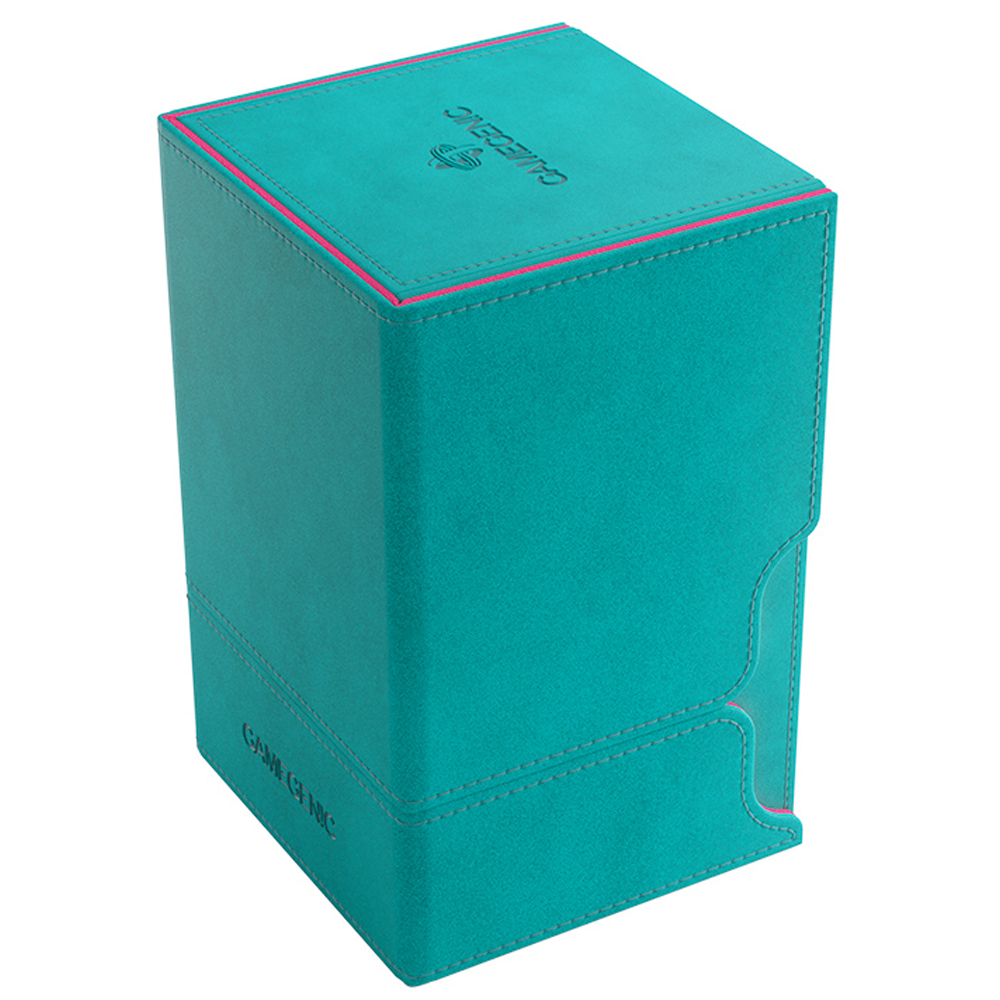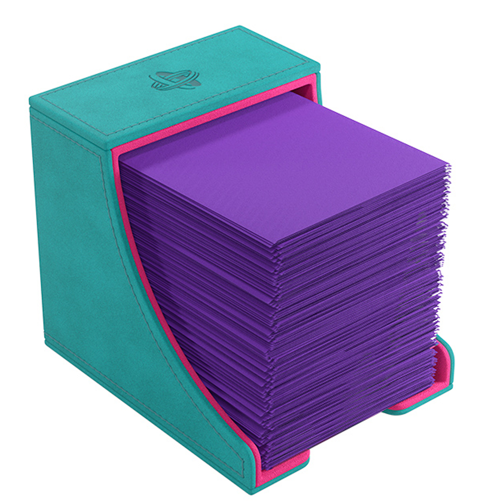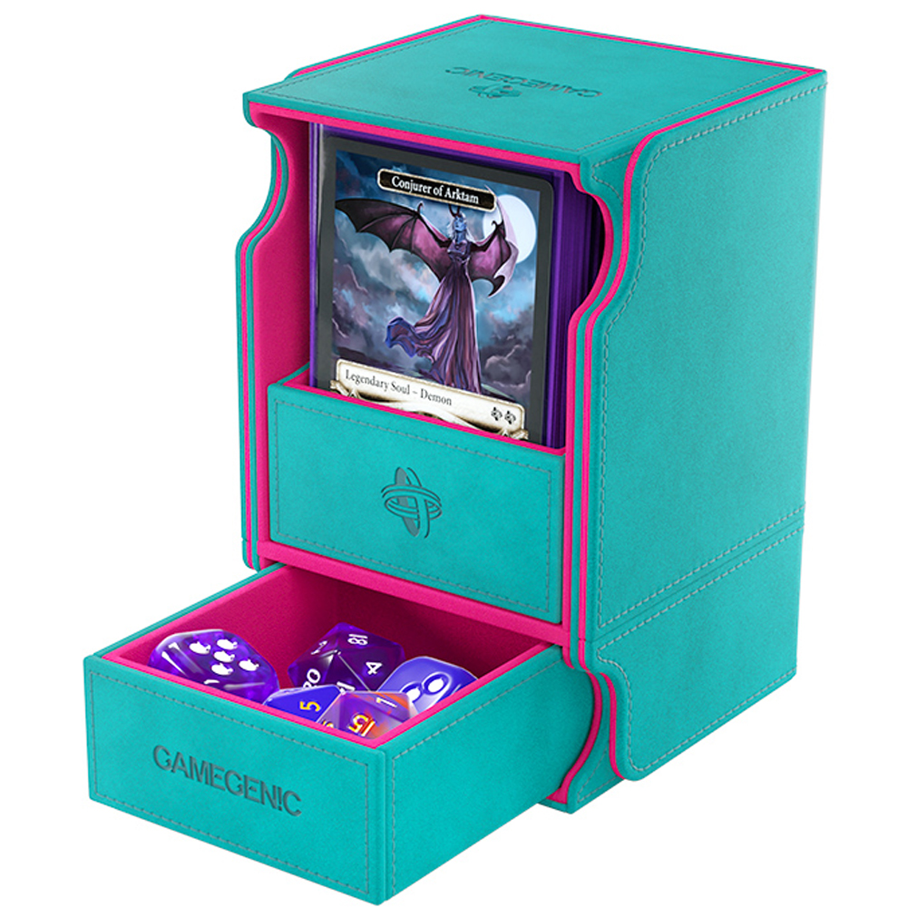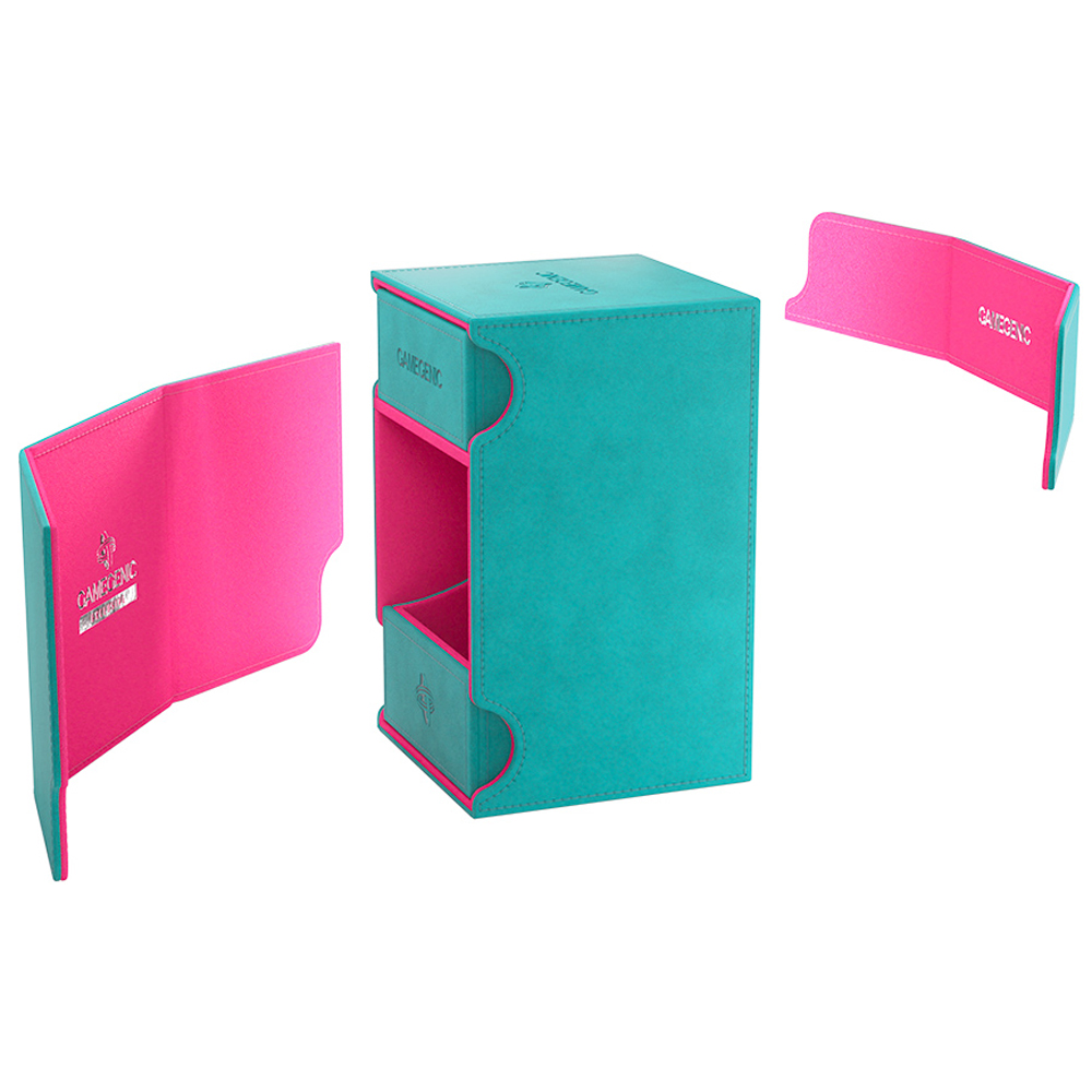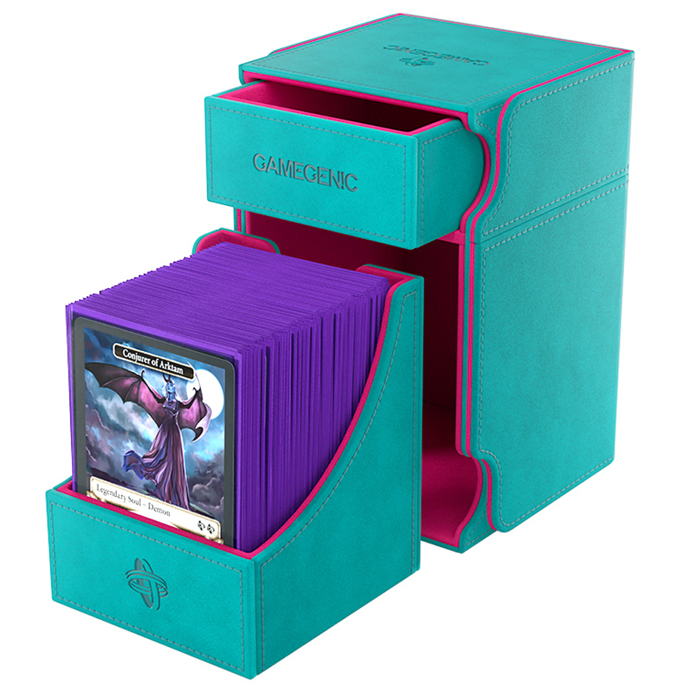 The Watchtower 100+ XL is made to fit 100 double sleeved cards in extra Thick Inner Sleeves. Elegant outside material in TEAL Nexofyber+ with soft PINK microfiber inner lining crate a new striking color combination! The convertible Watchtower 100+ XL combines deck box, accessory drawer, and card holder in one elegant box. The accessory drawer is perfect to house dice, tokens, and other small items.