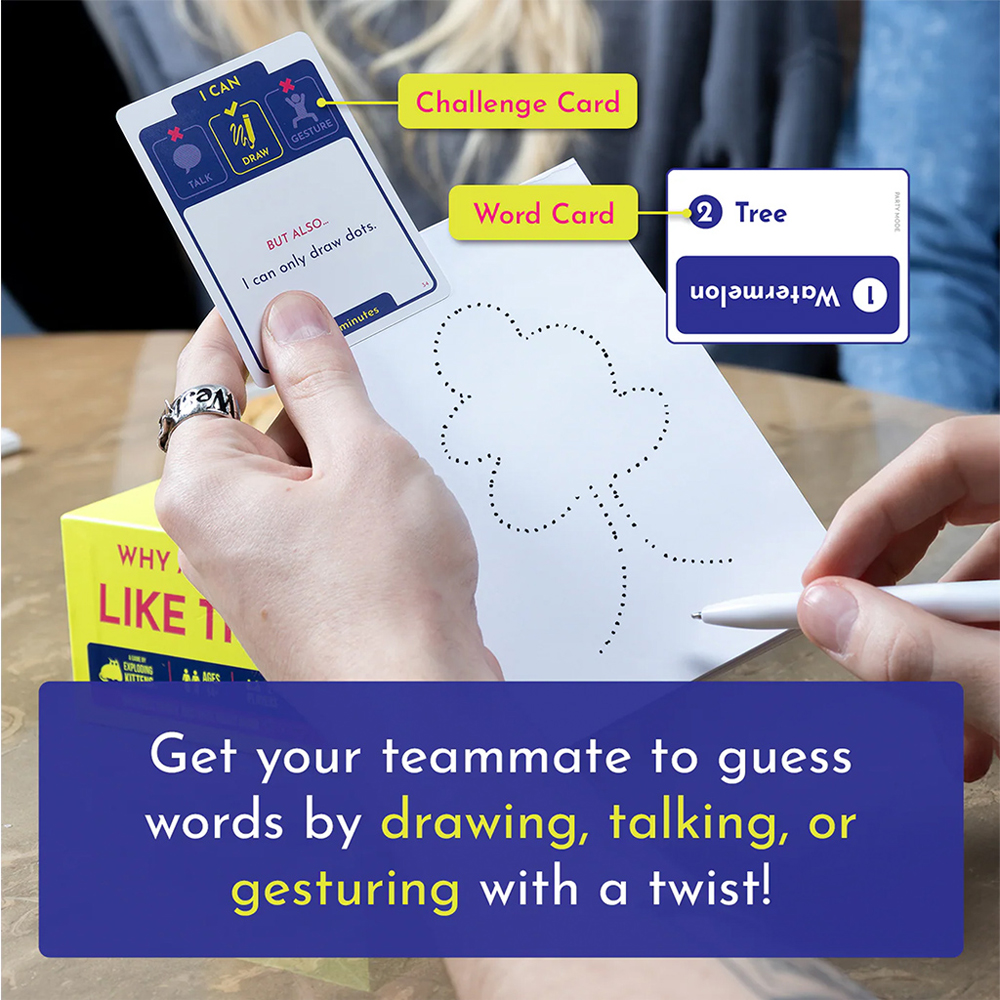 Why Are You Like This? (Party), you'll get a little playful, a little physical, and a little weird with your teammates. The goal is to get your team to guess as many secret words as possible before the timer runs out. To do this you can either talk, draw, or gesture. But each card also comes with an added twist to make your job a little harder - and more ludicrously entertaining. This travel sized game gets everyone out of their comfort zones and into a silly mood. It's the perfect date night game, teambuilding icebreaker, or adult party game and it's a unique gift for hostesses, birthdays, and beyond.