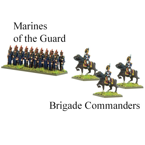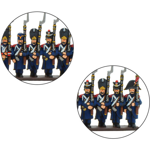 This plastic set contains enough troops to field three Guard battalions (80 soldiers in each) with accompanying mounted officers. Old Guard are recognizable by the brass plate on front of their bearskin hats and the rear patch atop them. The Middle Guard bearskins didn't carry the brass plate or rear patch so these can be painted over as if fur. We have added a few extra heads; those who wish to further differentiate their units can replace some of them with the shako or the bonnet to convey the poorer supplied Middle Guard although it isn't mandatory!