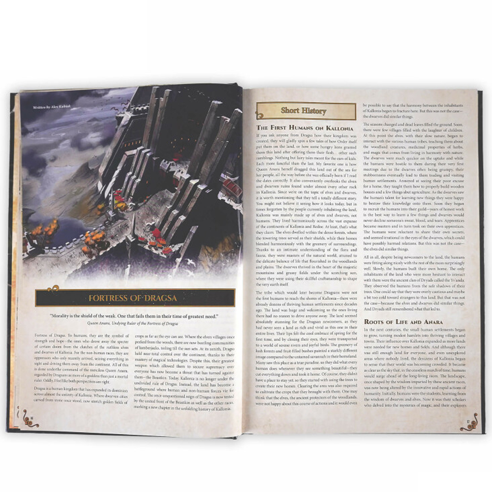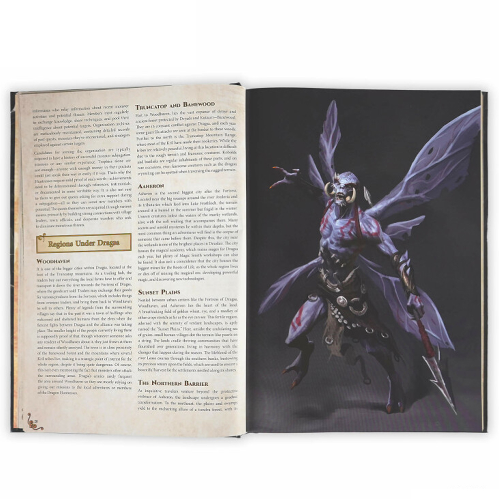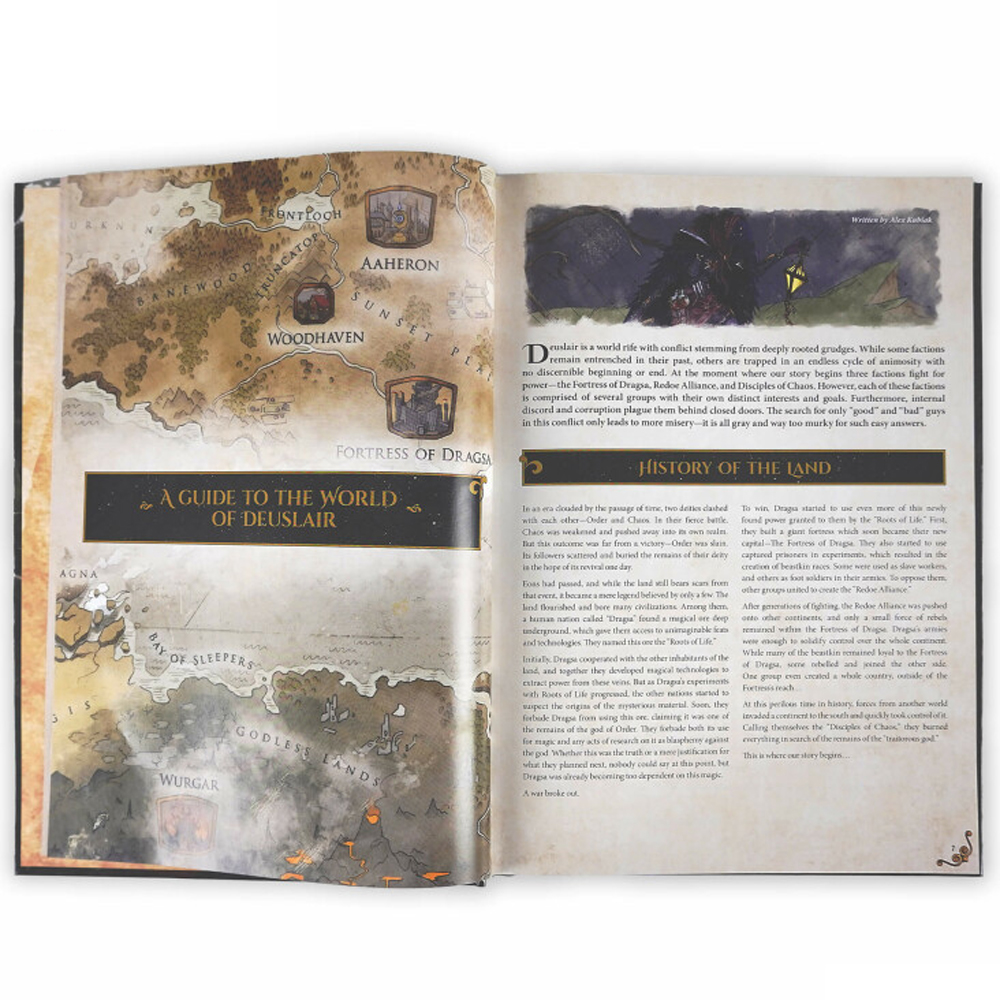 The book contains extensive and detailed information about the world of Deuslair. Explore the floating islands of the Republic of Misty Waters, unravel corruption eating out human nation of Dragsa, journey to the mysterious Banewood Asylum, a refuge for human-beast hybrids that escaped the rule of the Undying Queen Anara, or discover the intricacies of many other lands in this world.