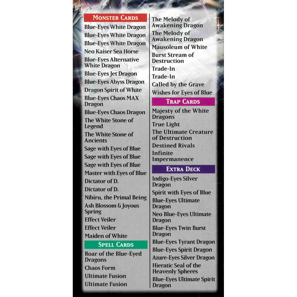 The Deck is packed with the cards that any "Blue-Eyes" Duelist needs for their Deck, like Blue-Eyes Alternative White Dragon, Blue-Eyes Jet Dragon, and even 3 copies of Sage with Eyes of Blue! It also has incredible cards like Nibiru the Primal Being, Ash Blossom & Joyous Spring, Infinite Impermanence, Effect Veiler, and more!